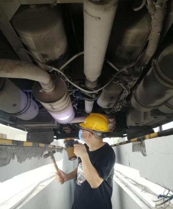 一把榔頭只為堅守源頭安全。在車站車輛例檢處,例檢員劉海正在烈日下作業(yè),滾燙的水泥地面、發(fā)熱的客車底盤和客車尾氣讓車輛例檢臺溫度更高。劉海不停地在車輛底部鉆進鉆出,從燈光、轉(zhuǎn)向、制動、底盤,到車胎、螺絲、安全帶、消防錘等,認(rèn)真檢查著每一個車輛部件??蛙嚨撞康母邷刈屗氯ヒ淮伪闳頋裢敢淮?,臉上的汗也順著頭發(fā)往下滴落。說起自己的工作,劉海認(rèn)為雖然工作環(huán)境惡劣一些,但是與售票員、檢票員并沒有什么不一樣,只是分工不同,做好車輛例檢工作,保障客車運行安全,是我們的責(zé)任,目的都是為旅客出行服務(wù)。